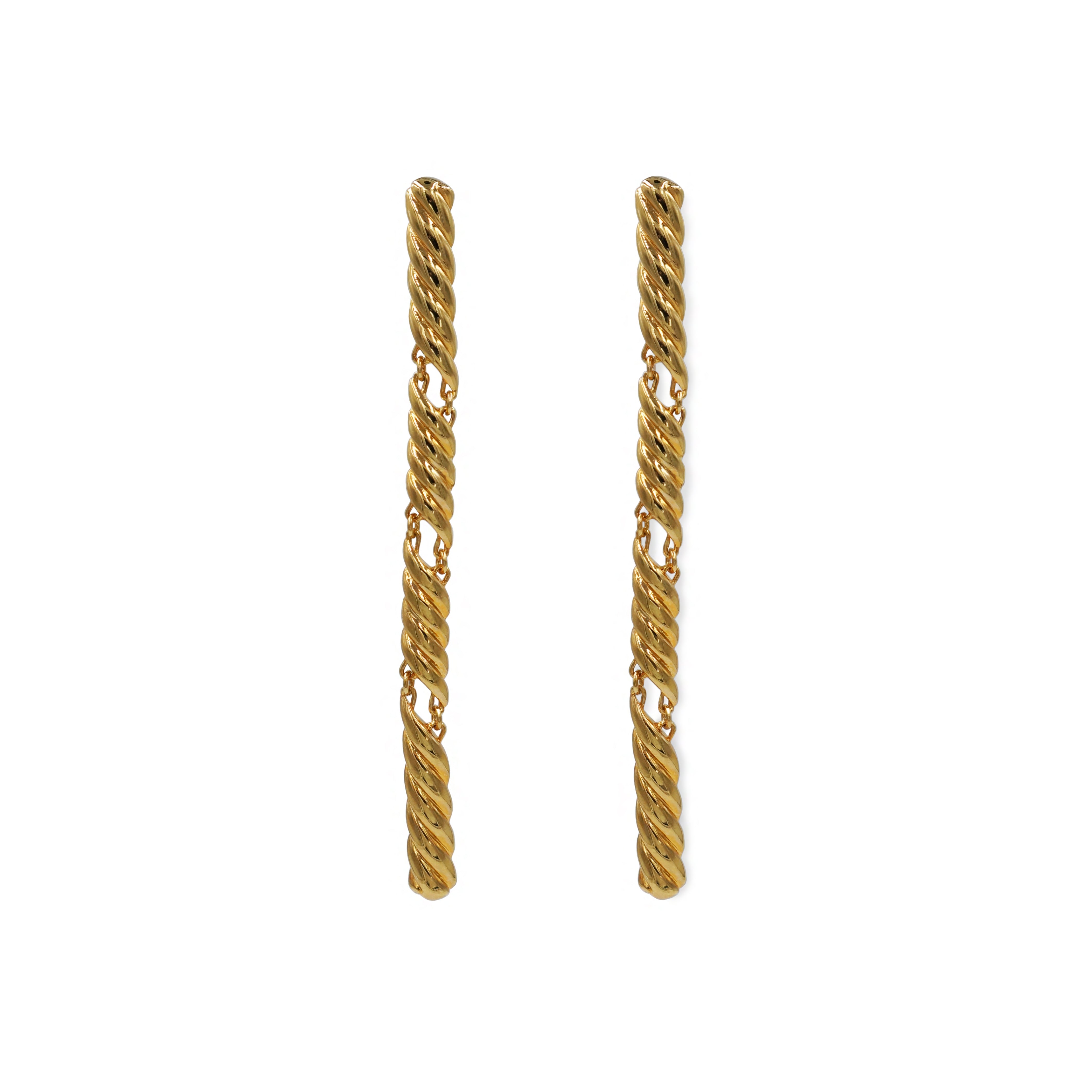 Aretes Soga largos parte de la colección Soga. Piezas inspiradas en sogas náuticas, con texturas que proyectan delgados filamentos que se unen para formar un objeto fuerte y resistente, recordándonos que la unión hace la fuerza.