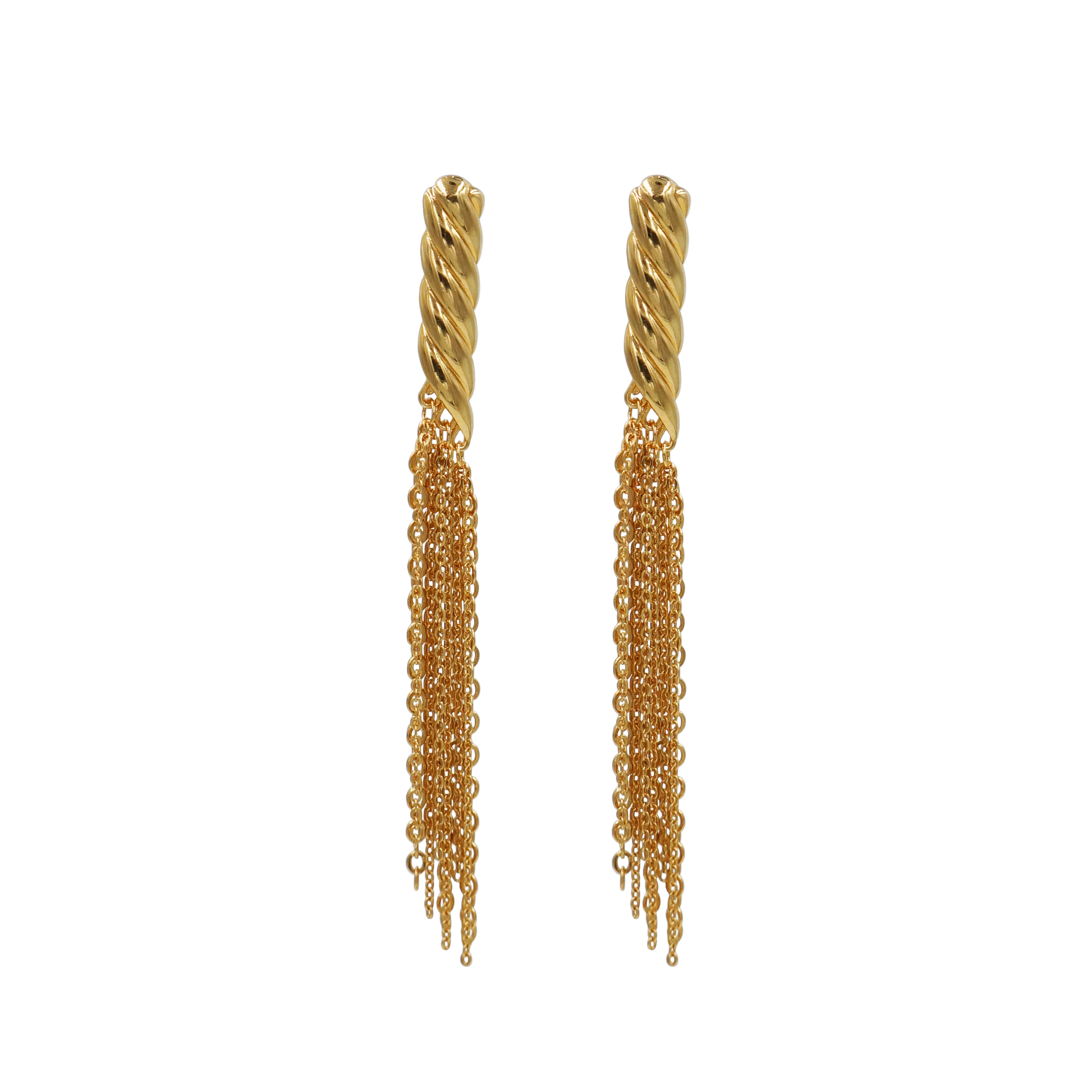 Aretes Soga S con cadenas colgantes, parte de la colección Soga.  Piezas inspiradas en sogas náuticas, con texturas que proyectan delgados filamentos que se unen para formar un objeto fuerte y resistente, recordándonos que la unión hace la fuerza.