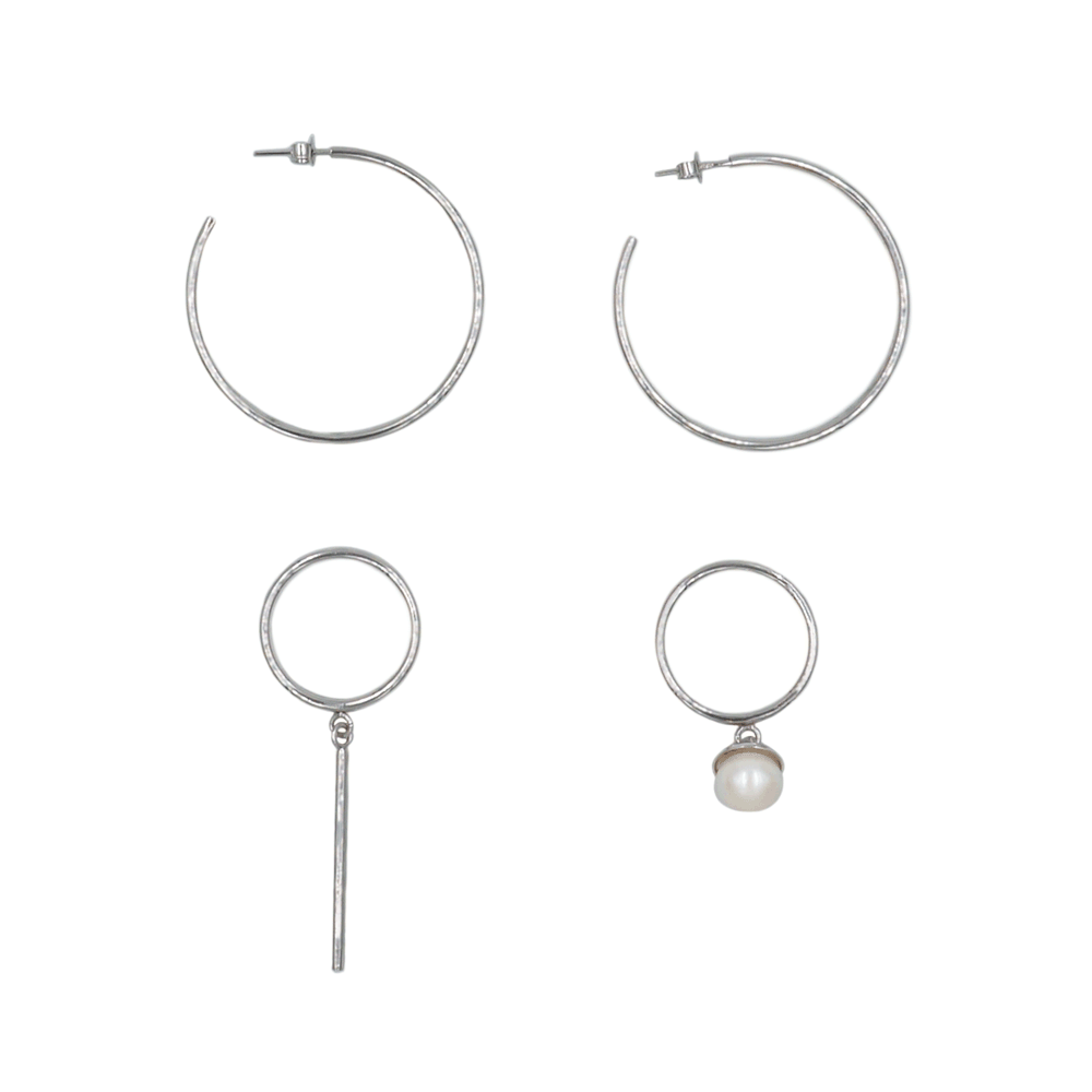 - Par de aretes conformados de: dos arracadas, un aro con perla y un aro con bastón.